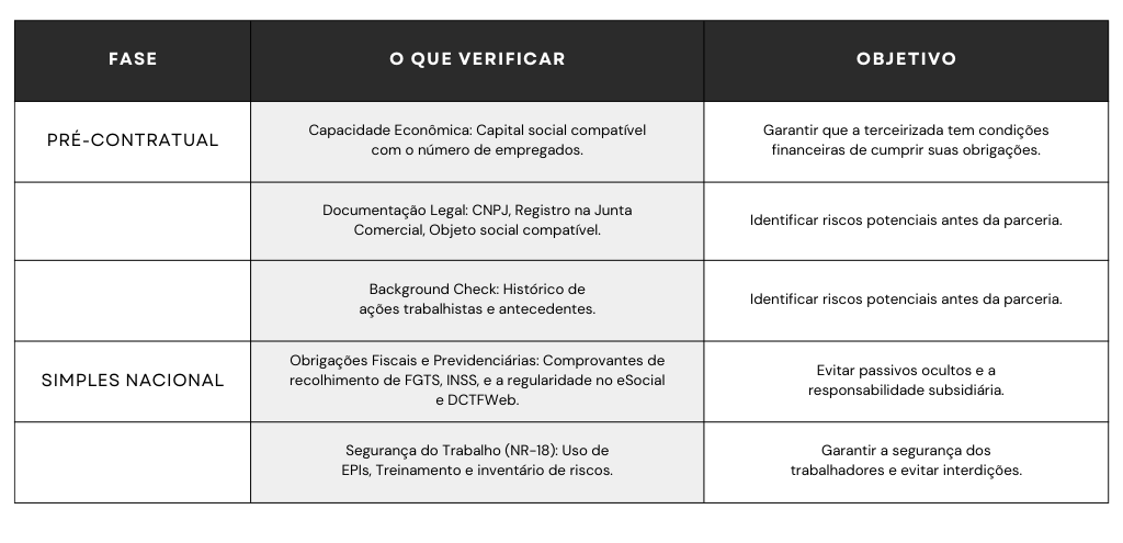 O processo de Due Diligence (diligência prévia) é a primeira linha de defesa da construtora. Ele deve ser aplicado tanto na fase pré-contratual quanto durante a execução do serviço: